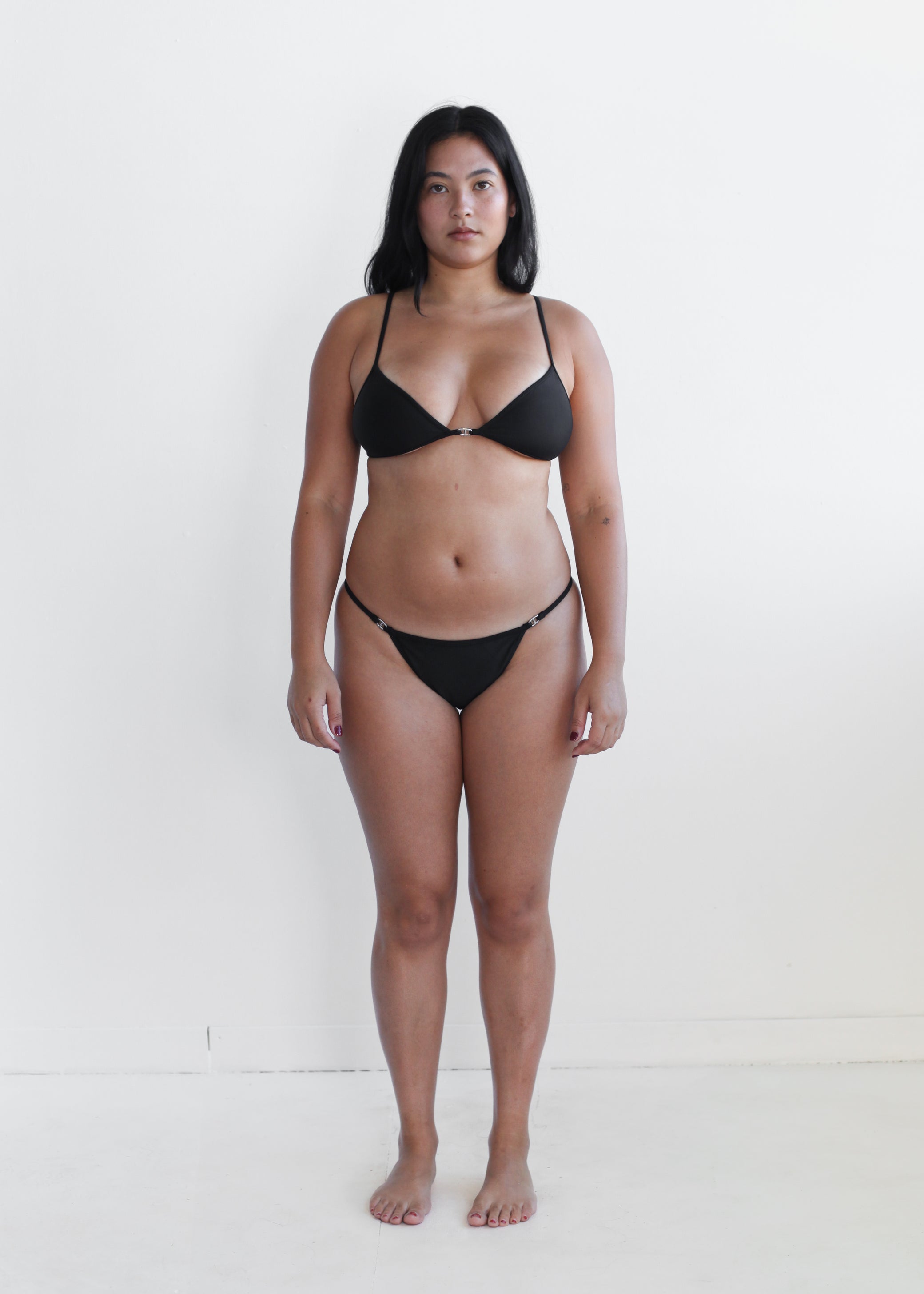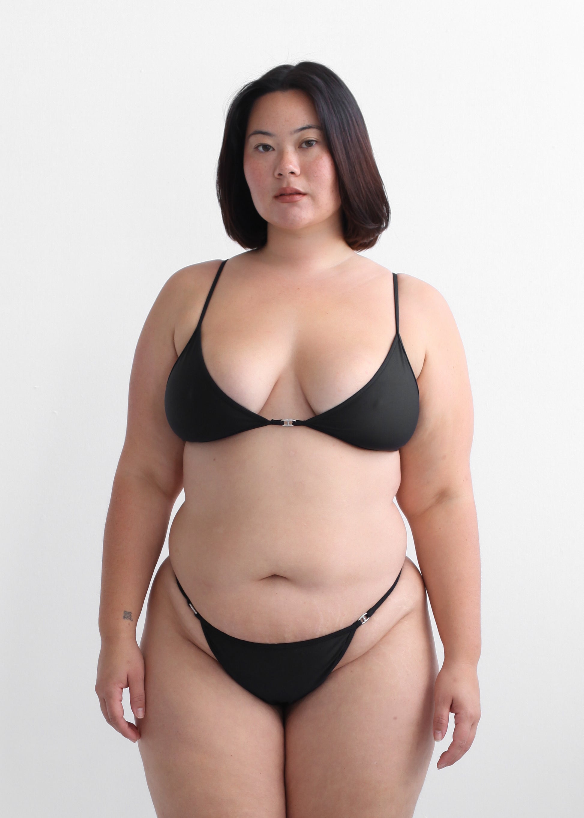 A supportive bralette bikini top with our signature anchor hardware. Adjustable hardware to support your bust and a tie back to offer flexible sizing. Available in a black as pictured, fully lined for comfort and durability.